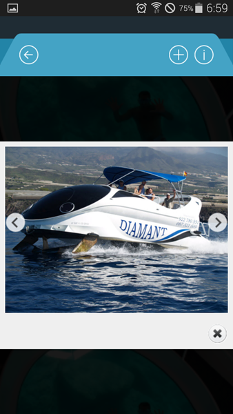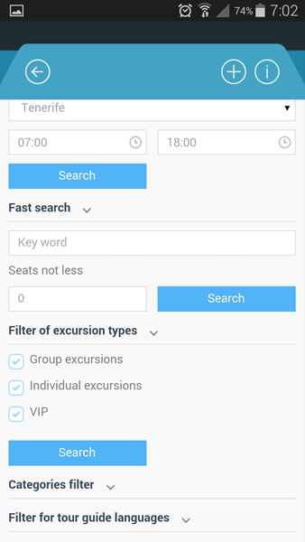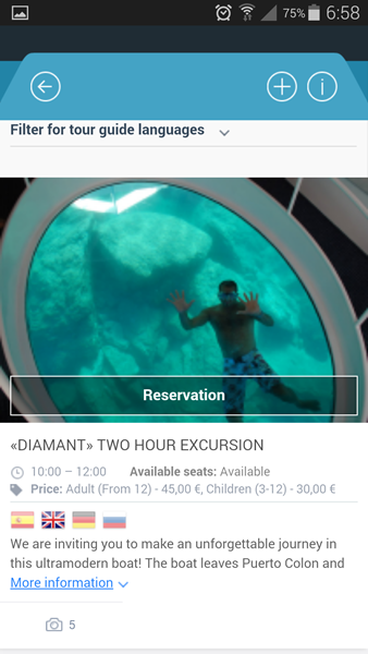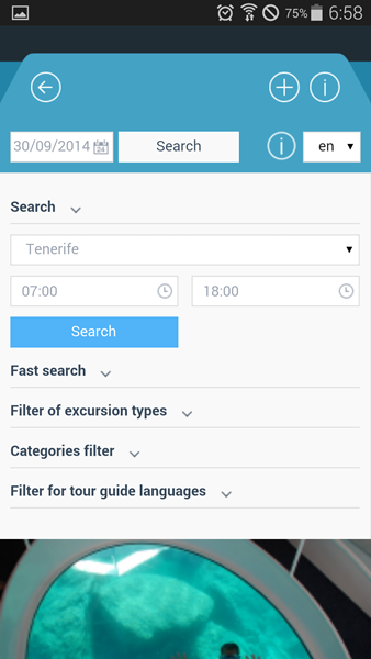 Trabajar con la aplicación "Excursions" da al usuario las siguientes posibilidades: 1) Describa el servicio con la selección de una categoría de excursión (supermarino, subacuático, en transporte, etc);